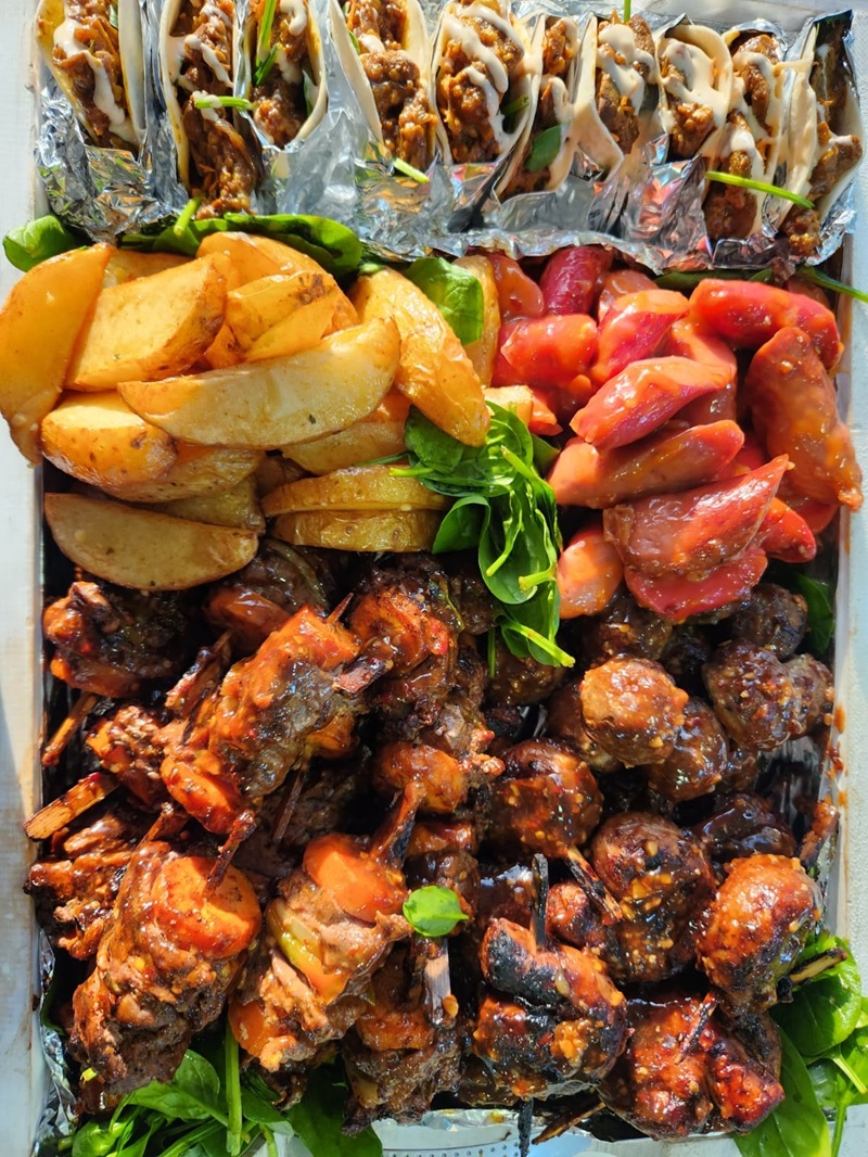 Grilled steak skewers , steak wraps, sausage, vienna, russians ,meat balls ,cajan potato wedges ,fresh salad ,chilli mayo dip 60pc