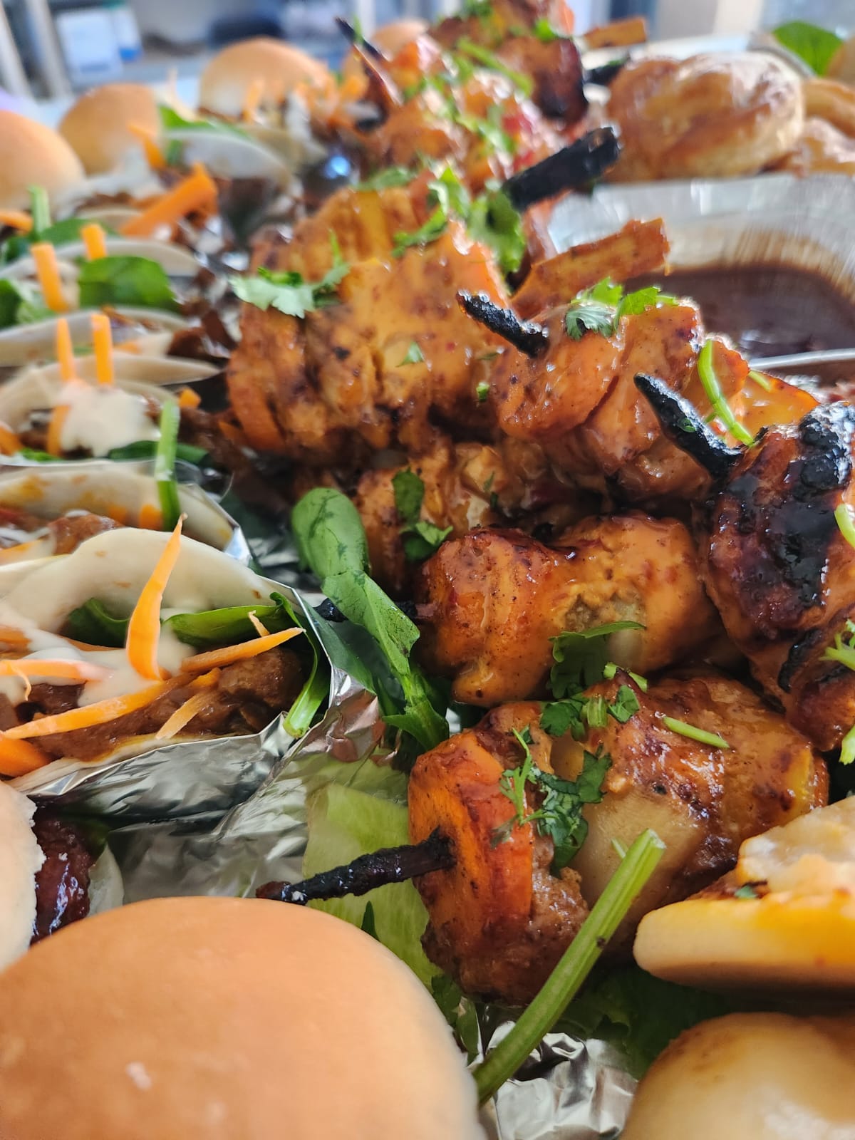 Chicken skewers , steak wraps , beef burger , assorted savoury